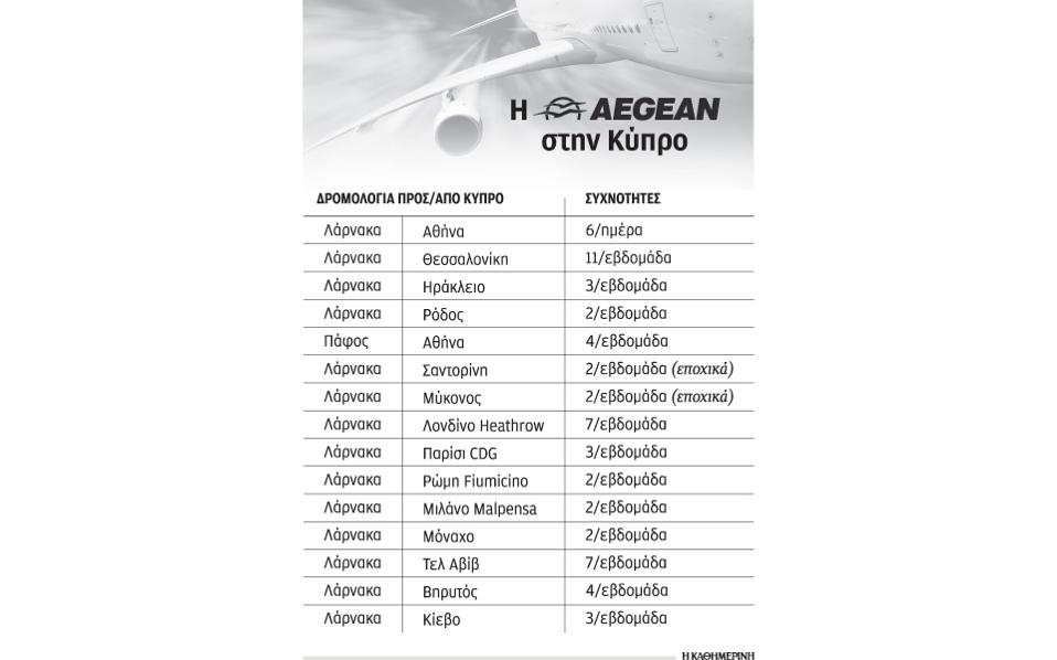 Απογειώνει τις δυνάμεις της στην Κύπρο η Aegean Airlines, η οποία επιχειρεί να καλύψει το κενό που προκάλεσε το κλείσιμο των Κυπριακών Αερογραμμών. Η εταιρεία ενισχύει τη βάση που διατηρεί στη Λάρνακα με επιπλέον τρία αεροσκάφη, ανεβάζοντας τον συνολικό αριθμό των Airbus A320 της στην Κύπρο σε τέσσερα, ενώ ο αριθμός των απευθείας προορισμών που θα εκτελεί από/προς την Κύπρο ανεβαίνει στους 14. Χθες ο αντιπρόεδρος της Aegean Airlines Ευτ. Βασιλάκης ανακοίνωσε στην Κύπρο τα σχέδια της εταιρείας για επέκταση της δραστηριότητάς της στο νησί, ενώ δεν απέκλεισε το ενδεχόμενο να ενδιαφερθεί για το εμπορικό σήμα και την επωνυμία των Κυπριακών Αερογραμμών, εξετάζοντας, όπως σημείωσε, τις πιθανές προτάσεις της κυπριακής κυβέρνησης.